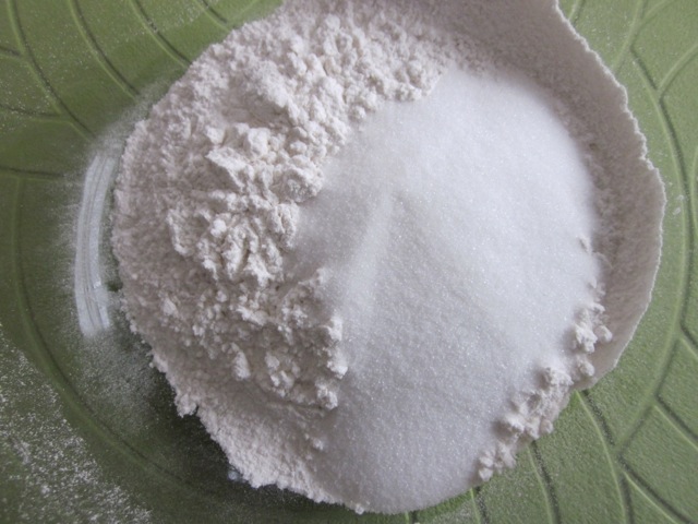 Sift the flour and baking powder into a bowl. Stir in the sugar.