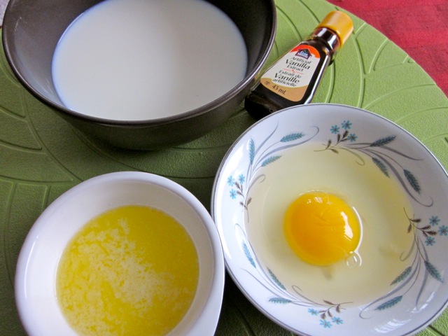 Whisk together the egg, milk, vanilla essence (extract) and melted butter in a separate bowl.