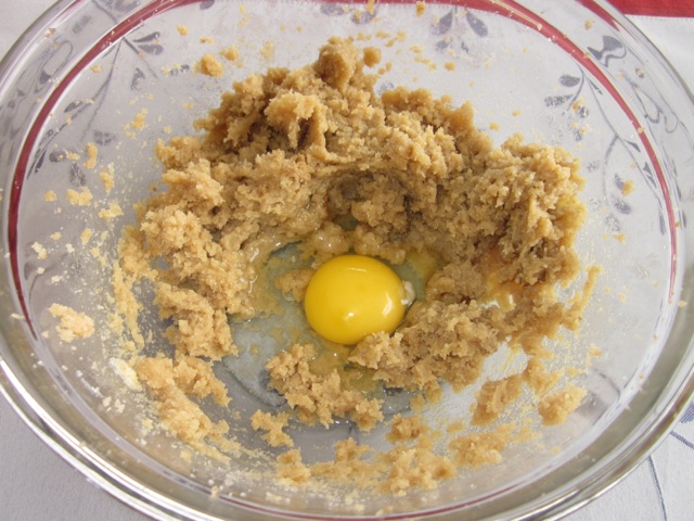 2. Beat butter, vanilla essence and sugars until fluffy. Add the egg, beat until fluffy.
