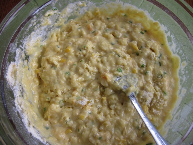 - In a separate bowl, whisk the eggs, oil, cream style corn, cheese, chives and milk. Add this mixture to the well and mix quickly with a fork until all ingredients are just combined. Do not over-mix. The batter should look quite lumpy. If it looks too thick, add a little more milk.