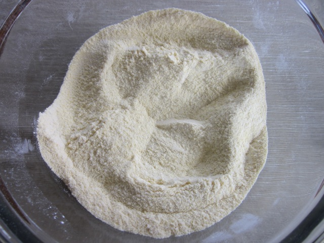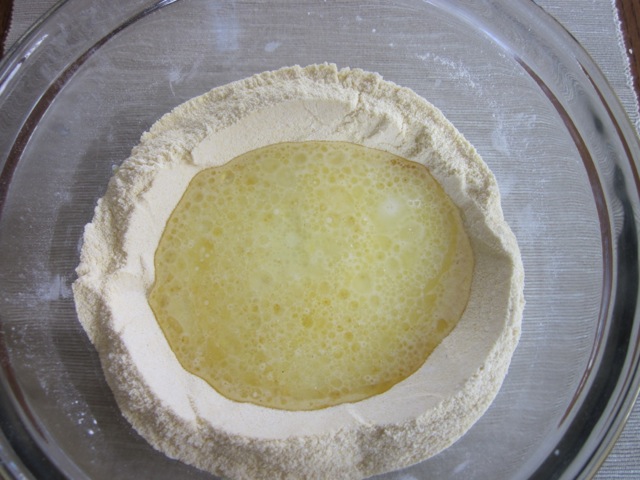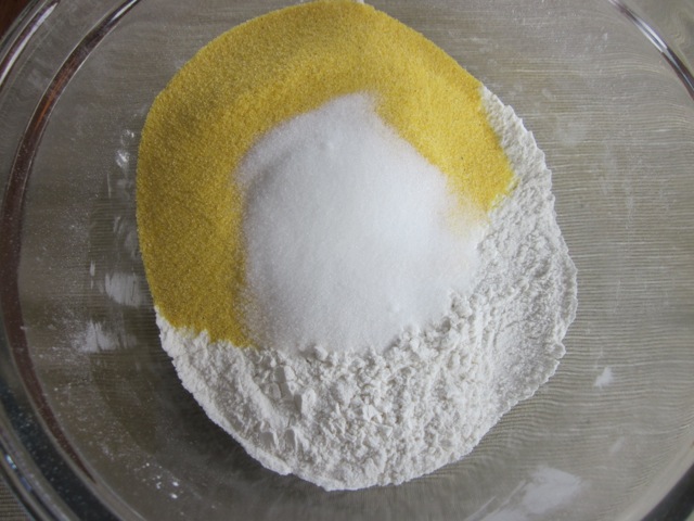 2. Sift the flour, salt and baking powder. Stir in the cornmeal and sugar and make a well in the centre.