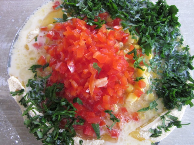 4. Add the egg mixture, capsicum, corn, and parsley to the well. Stir quickly with a wooden spoon or rubber spatula until all ingredients are just moistened. Do not over-mix, the mixture should look quite lumpy.