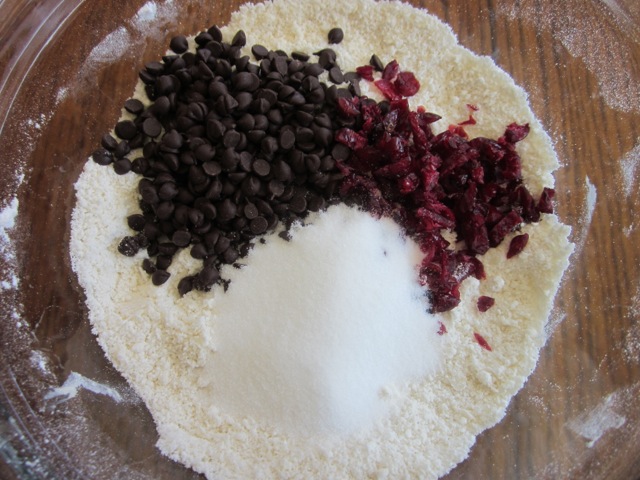 2. Sift the flour, baking powder and salt into a large bowl. Add the diced butter and rub into the flour briefly, and lightly, using your fingertips, until the mixture resembles fine breadcrumbs. Stir in the sugar, chocolate chips and cranberry. Make a well in the centre of the flour mixture.