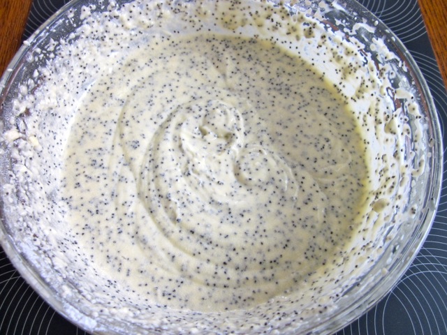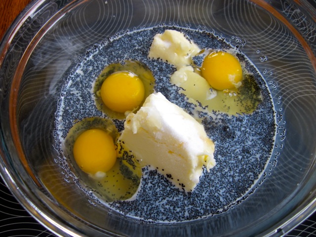 Add butter, essence, sugar, eggs to the poppy seed mixture.