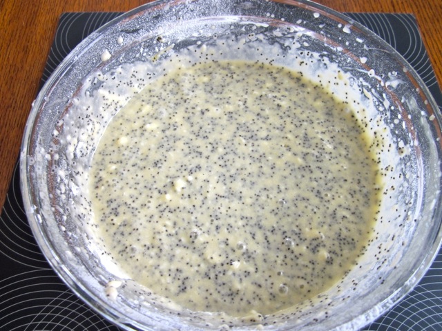 - Add the butter, essence, sugar, eggs, and sifted flour to poppy seed mixture. Give it a quick stir to loosely combine ingredients.