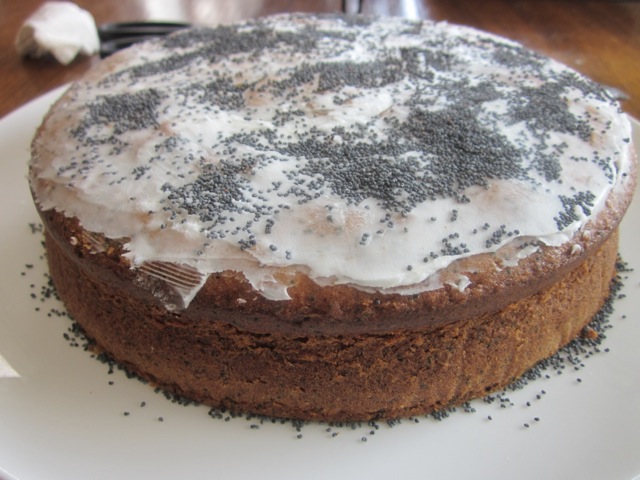 The second time I used a 20cm (8 inch) round pan. I covered the round cake with a bit of left-over butter icing and then sprinkled with poppy seeds.