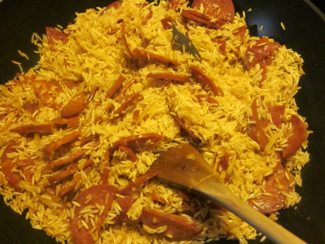 - Add the chorizo and cook, stirring, for 2 minutes until onions are coated with chorizo. Increase heat, stir in rice, bay leaf, paprika, and cayenne (if using), stir and fry for 3 minutes, until rice is fairly dry.