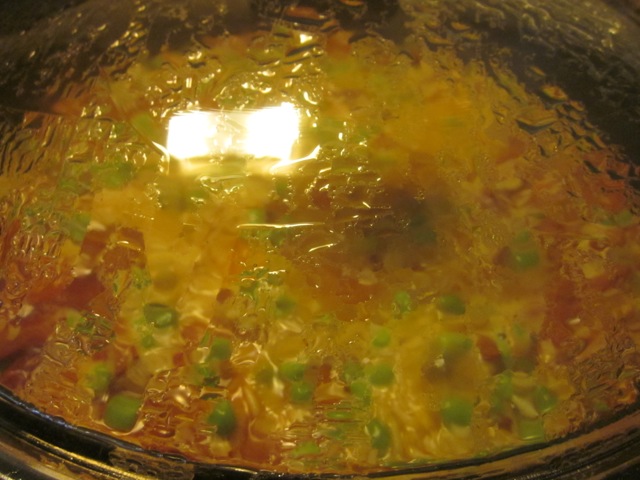 Add frozen peas, sun-dried tomatoes, and tomato paste.