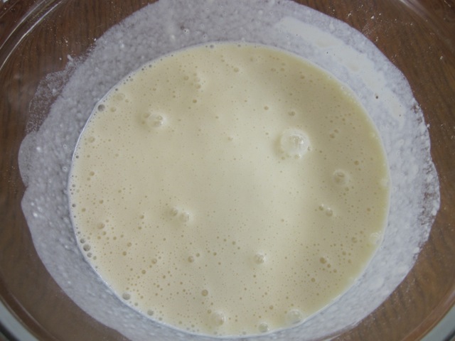 Pour the egg-milk mixture to the well and using a whisk or wooden spoon, gradually draw in the flour until a smooth batter is formed. Do not over mix, otherwise the crepes will be tough and leathery.