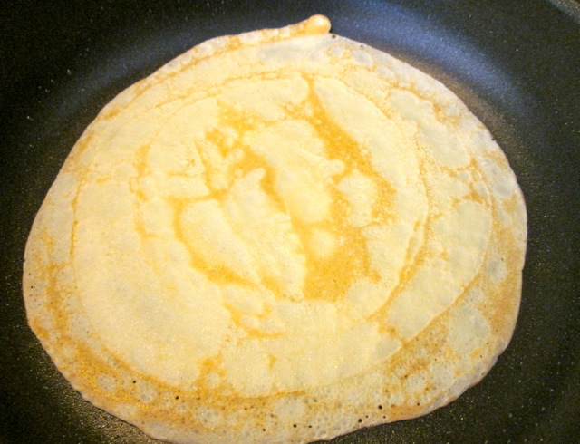 Pour batter into to the pan (skillet), swirl to thinly coat the base, pour off excess. Cook for about 20 seconds until the edges just begin to curl.