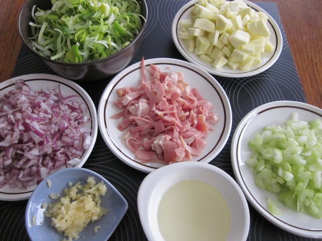 - Heat a large pan over medium heat, add olive oil, fry bacon slices until slightly browned. Add the onion, garlic, leek, celery, zucchini (courgette) and bay leaves and fry for 5 minutes, until softened.