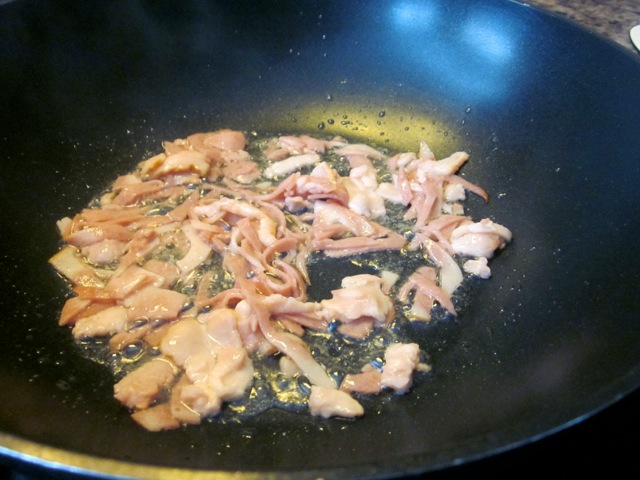 Fry bacon slices until slightly browned.