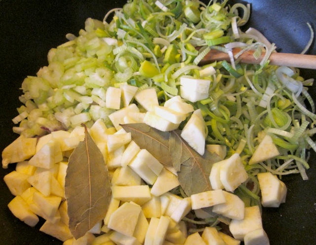 Add the onion, garlic, leek, celery, zucchini (courgette) and bay leaves