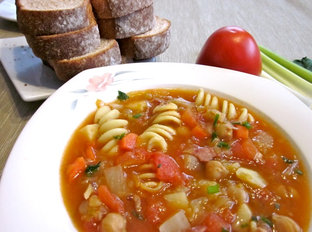 Today, I want to share with you my version of minestrone. I usually serve it as a complete meal with some whole wheat or French bread. It’s very filling. I hope you will like it!