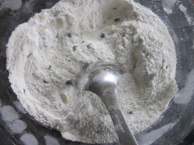 2. Sift the flour, baking soda (bicarbonate of Soda) and baking powder (and salt if using). Add the sugar and chocolate chips. Mix thoroughly and make a well in the centre.