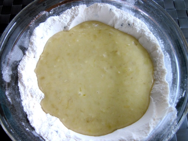 Mix eggs, mashed banana, melted butter and buttermilk, in a separate bowl