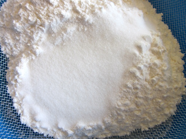 Sift the flour, salt and sugar. The sugar we have here is so fine, it can just be sifted.