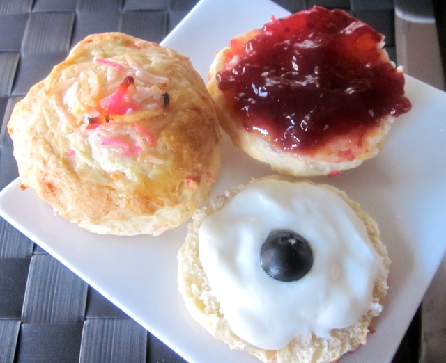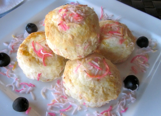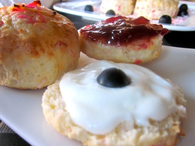 Today I want to share with you the recipe for the rainbow coconut buttermilk scones. I served mine with sour cream, topped with olives and jam. I loved it, it tasted very nice.