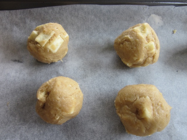 - Fold in sifted flour, then chocolate. Roll tablespoons of mixture into balls. Place on prepared baking sheets, 7-8cm apart. Bake 15-20 minutes, rotating sheets halfway through the baking, until golden. Let cool 5 minutes before transferring onto cooling rack.