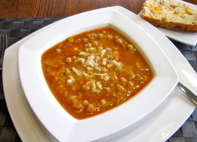 Today I want to share a recipe for Spicy Chickpea Soup With Coconut Milk, served with onion and cheese bread. Red onions give the best flavour and colour. Most of the time I add ham too. You know, by now, that I love meaty things and always find an excuse to add meat to everything. I think fried crisp bacon shredded into pieces would be a great addition, too, instead of ham. I really enjoyed eating this soup. It was well worth the trouble taken and the coconut milk and the Parmigiano Reggiano added an extra punch of flavour.