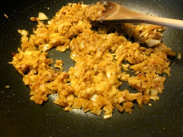 Add the spices (ginger, curry powder, cumin, paprika and cayenne, if using) and fry for one minute.