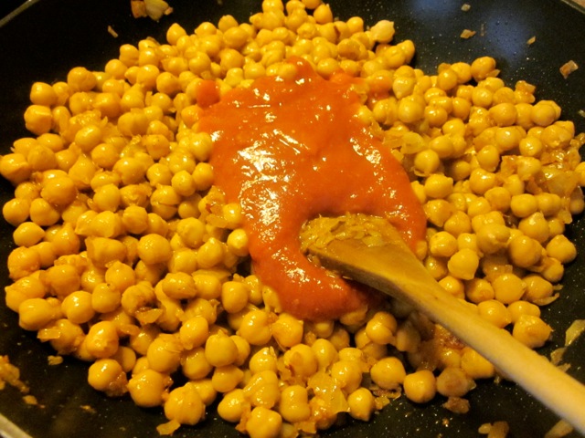 - Add the chickpeas and crushed tomatoes, 2½ cups stock and the coconut milk. Season with salt and pepper, bring to the boil, reduce heat, cover and simmer 30 minutes until chickpeas are tender.