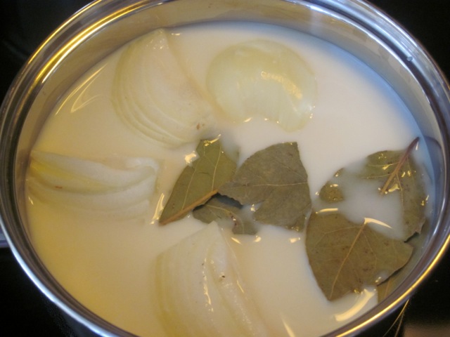 - Pour the milk into a small pan and add the quartered onion and bay leaves to the milk. Bring milk to just below boiling point and remove from the heat. Cover and infuse for 15 minutes.