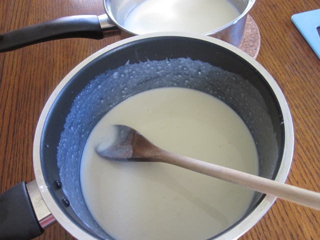 Remove roux (cooked flour) from heat. Strain the infused milk, then gradually mix into the roux, beating well between each addition.
