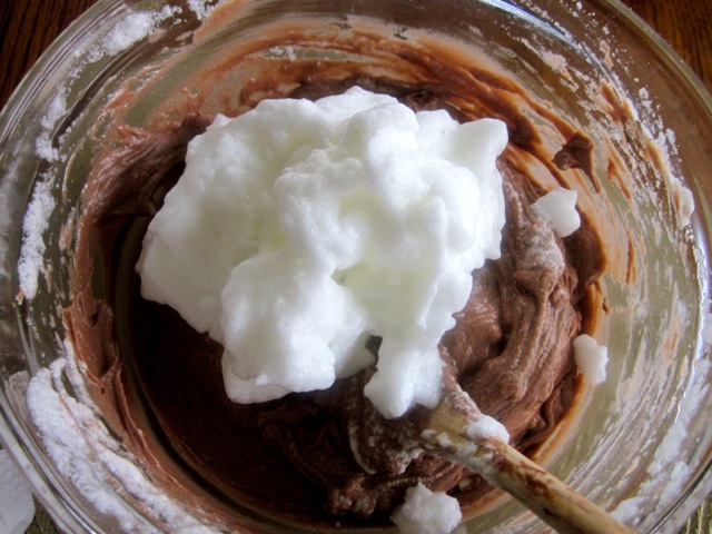 Beat egg whites until soft peaks form, fold half the egg whites into the mixture, then fold remaining egg whites gently into the mixture.