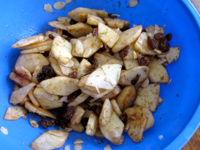 3. For the filling: peel, core and slice the apples. Mix sugar with cinnamon and nutmeg. Place the apples in a bowl with the flaked almonds, raisins, lemon rind, and cinnamon sugar. Mix together lightly. (Do this just before rolling the pastry)