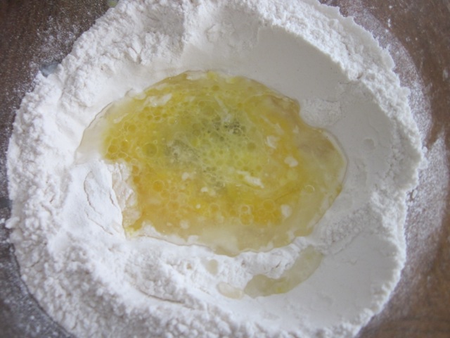 Apple Strudel myfavouritepastime.com_6444Make a well in the centre, add the egg with 4-5  tablespoons of tepid water, two tablespoons oil and ½ teaspoon cider vinegar (optional). Mix to a pliable dough and continue to knead for about 15 minutes until the dough is silky smooth and very elastic. (this takes about 5 minutes in a mixer using the dough hook).