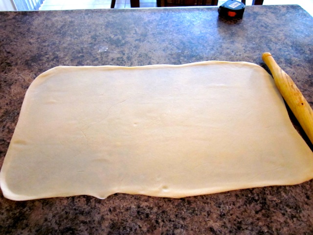 Apple Strudel myfavouritepastime.com_6451Roll the relaxed pastry out as thin as you can on a lightly floured surface with a warmed rolling pin to an oblong 12” x 20” (30cm x 52cm).