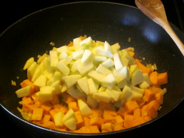 - Melt butter or margarine, in a large saucepan (or add sunflower oil). Cook the onions and sweet potatoes for 5 minutes.