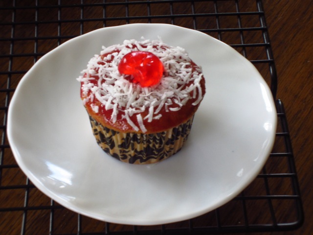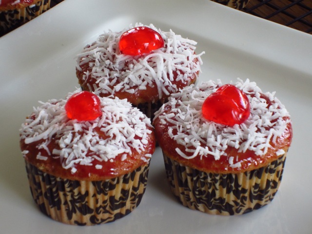 4. To decorate: warm the raspberry jam in the microwave for a few seconds. Brush the warmed jam over the top of each cupcake. Lightly coat the top of each cupcake with coconut then finish with a halved cherry