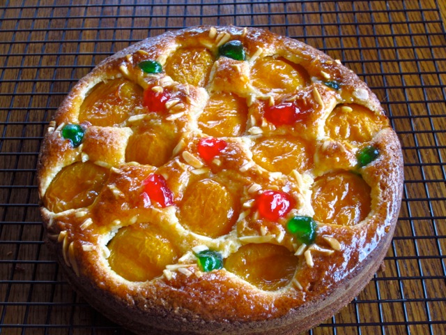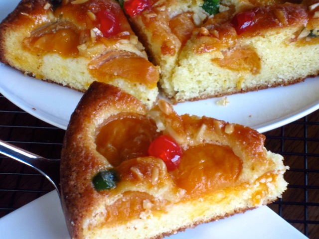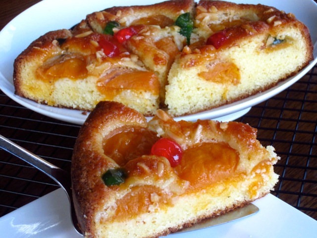 Apricot Almond Cake myfavouritepastime.com_7025I followed the recipe to the letter. I didn’t have time to change anything or to think of other fancy ideas (except for the addition of  red and green glace cherries on top-you understand by now, that I love pretty things). I’m glad I just followed Sujatha’s instructions, because I was so happy with the end result. For the original recipe, from Sujatha’s blog, please click here. I really enjoyed this cake, as a dessert, with lots of ice cream. (my food diary is wincing, of late!)
