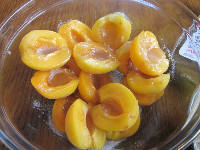 2. Slice the apricots into halves. Remove the pits and place the halves in a bowl. Sprinkle the 2 tablespoons of sugar over the fruit and set aside to soften while you prepare the batter. You may also add a splash of alcohol or liqueur to add extra flavour. I added some Baileys, Irish Cream, hazelnut flavour at this stage.