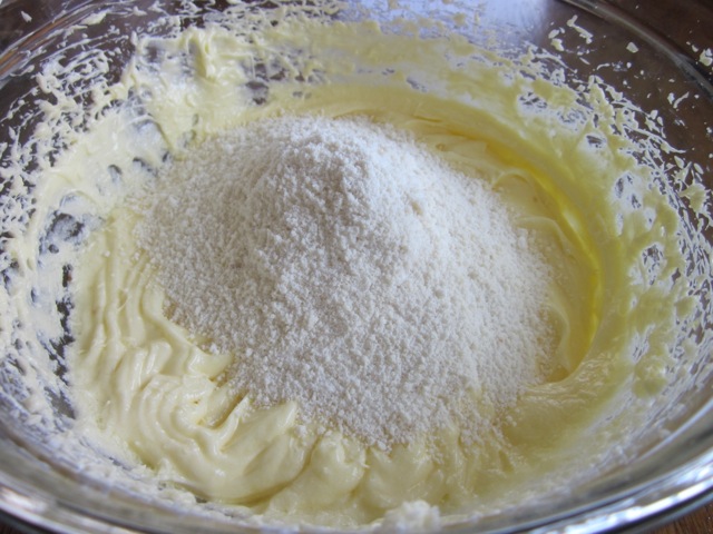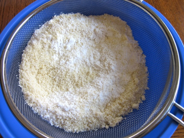 Sift together the flour, baking powder and ground almonds (almond flour).