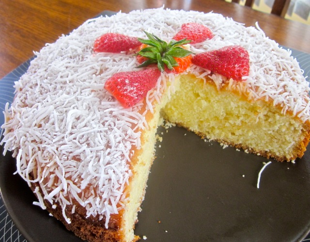 Brush the cake with some warmed and sieved apricot jam and sprinkled some shredded coconut on top.