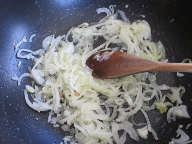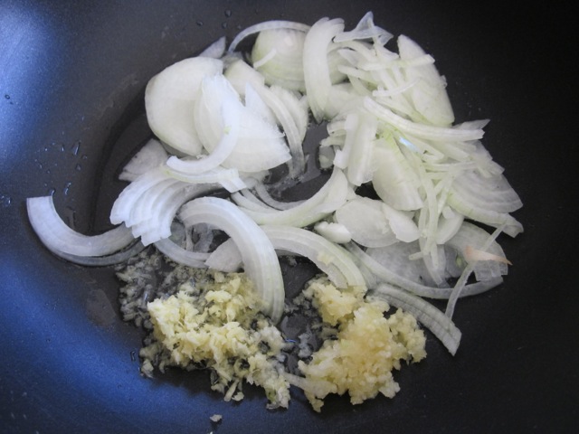2. Heat the oil or ghee in a large non-stick pan. Fry onion, garlic and ginger, over medium heat until soft.