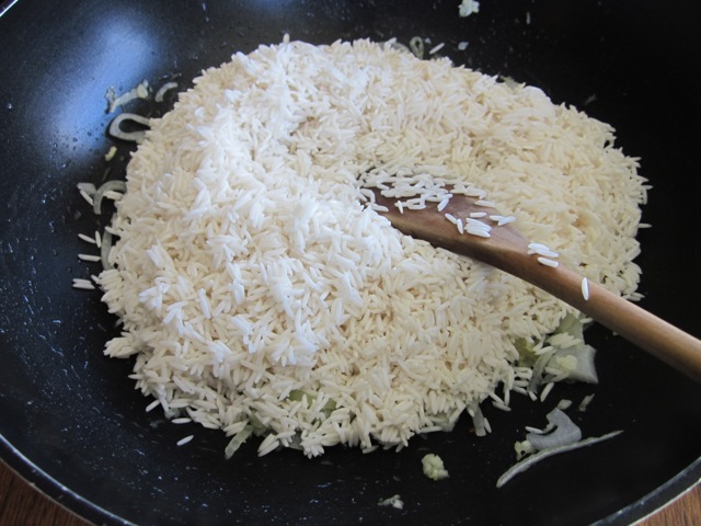 Curried Rice and Lentils myfavouritepastime.com_7368Increase heat to medium hot, add rice and stir and fry for 4 minutes till almost dry.