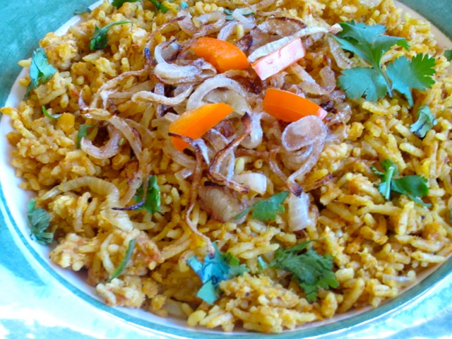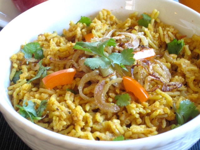 6. After 12 minutes turn off the  heat and leave undisturbed for a further 12 minutes. Lift the lid, fluff the rice and serve immediately garnished with lots of fried onion, or cilantro, or green onions (I leave it to you. We had ours with lots of fried, crispy onions).