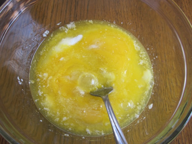 - In another bowl, combine the sugar, eggs and melted butter and whisk well until combined.