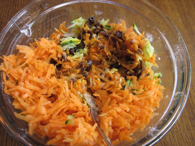 Fold in zucchini (courgettes), carrots and soaked dates,