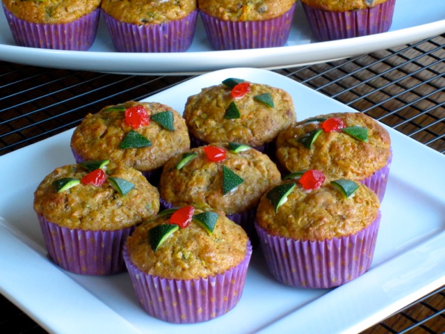 These muffins started as zucchini and carrot muffins, but then I wanted something more elaborate so I added the zest and juice of an orange and some dates, of course. The finished product looked so basic (I love beautiful things) so I decided to decorate them with zucchini, glace cherries and some candied peel. I was feeling lazy, as usual, so I didn’t want anything too elaborate. Anyway we enjoyed eating the muffins, and that’s what really matters. I hope you enjoy them too, if you ever make them.
