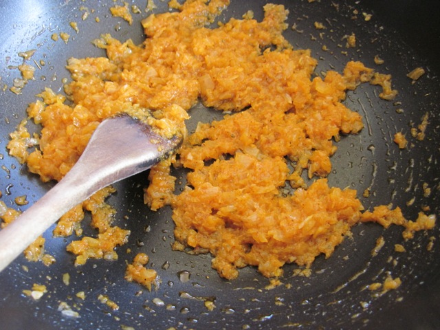 Meatballs in Nutty Coconut Curry myfavouritepastime.com_7567For the curry sauce: heat oil in a large non-stick pan (pot), add onions and stir-fry for 3-5 minutes until golden.