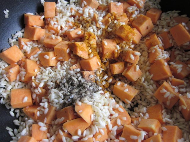 Sweet Potato Risotto myfavouritepastime.com_8469If using turmeric, add it at this point and stir until the rice is coated yellow. Add some pepper at this point as well.