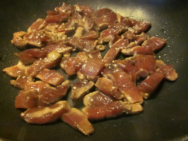 3. Heat oil in wok or skillet over medium high heat and fry the pork for 3-5 minutes over high heat until no longer pink and cooked through.