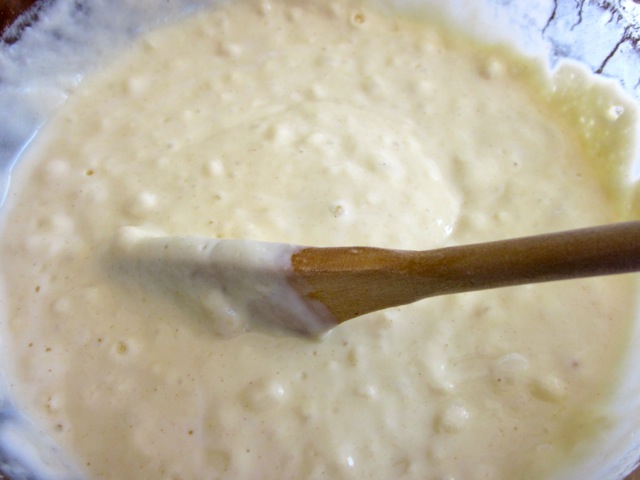 3. Pour the buttermilk mixture into the well and mix gently with a wooden spoon (do not over mix otherwise you’ll have tough pancakes-the mixture should look a little lumpy). If the batter looks too thick, add a little buttermilk, 1 teaspoon at a time.