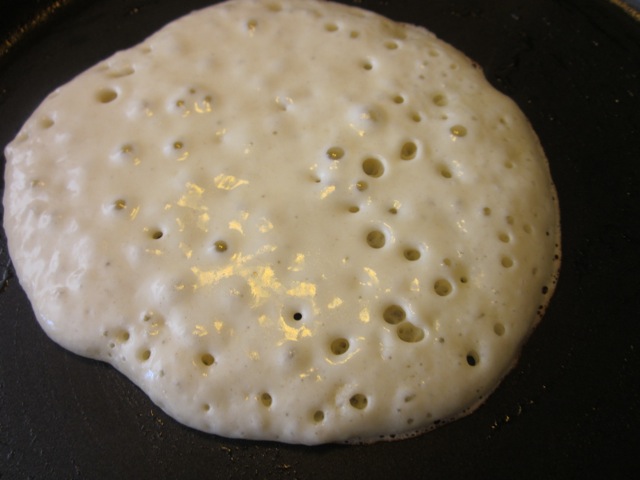 Heat a non-stick skillet (pan) on medium heat and brush a little oil using a silicon brush. Using ⅓ cup measuring cup, pour butter into the skillet and cook until bubbles form