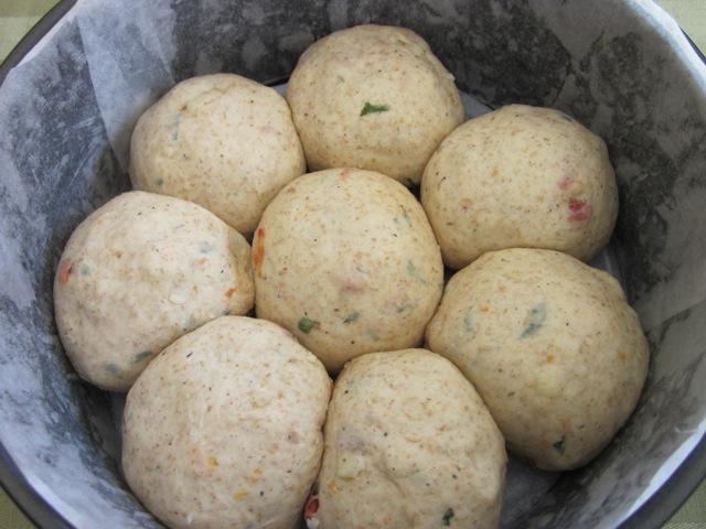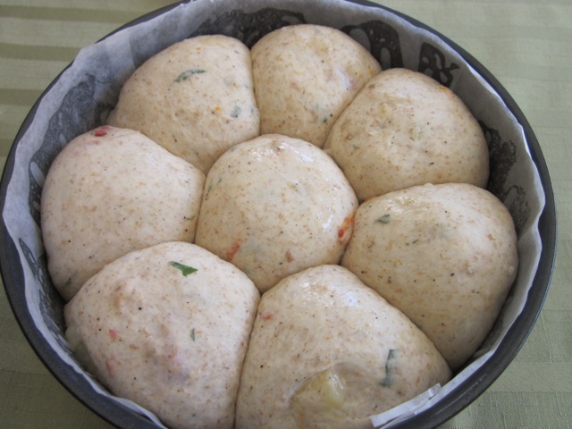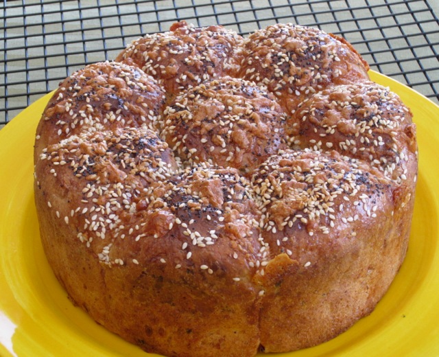 - Knock back the dough until smooth and pliable and then divide into 8 equal portions. Divide the cheese into 8 portions and knead each cheese portion into the dough portions. Form each dough into a smooth round and arrange into the tin, placing seven round the edge with one in the middle. Cover with an oiled cling wrap and place in a warm place for 20-30 minutes or until well risen.